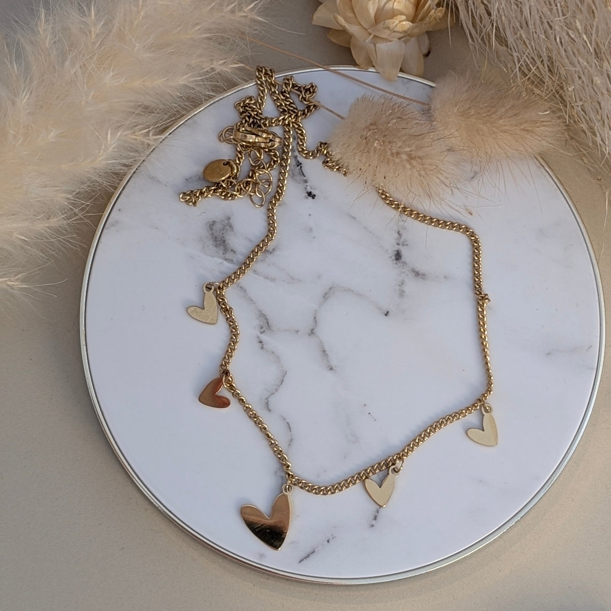 Diese Kette ist einfach zum Verlieben! Fünf kleine, glänzend polierte Herz-Charms baumeln verspielt an einer hochwertigen, goldplattierten Gliederkette und warten nur darauf, deinen Look zu vervollständigen.