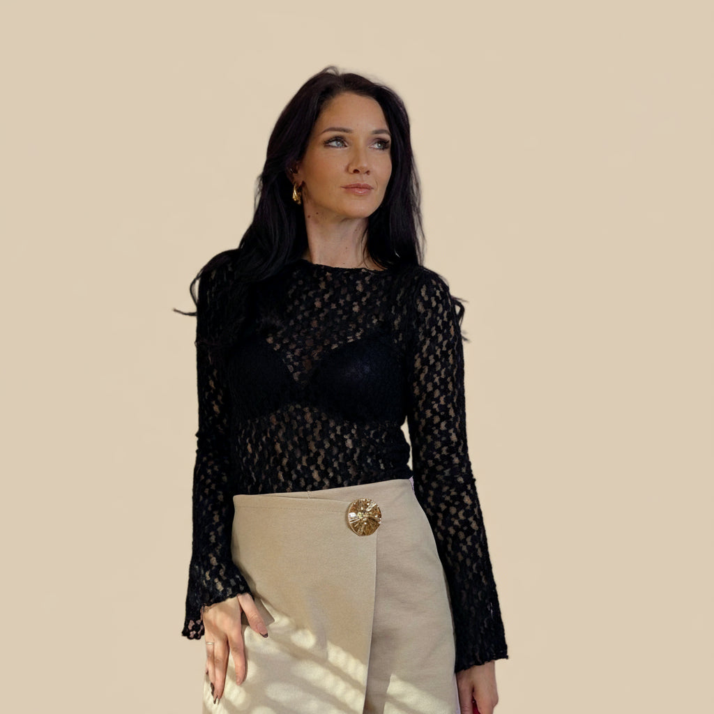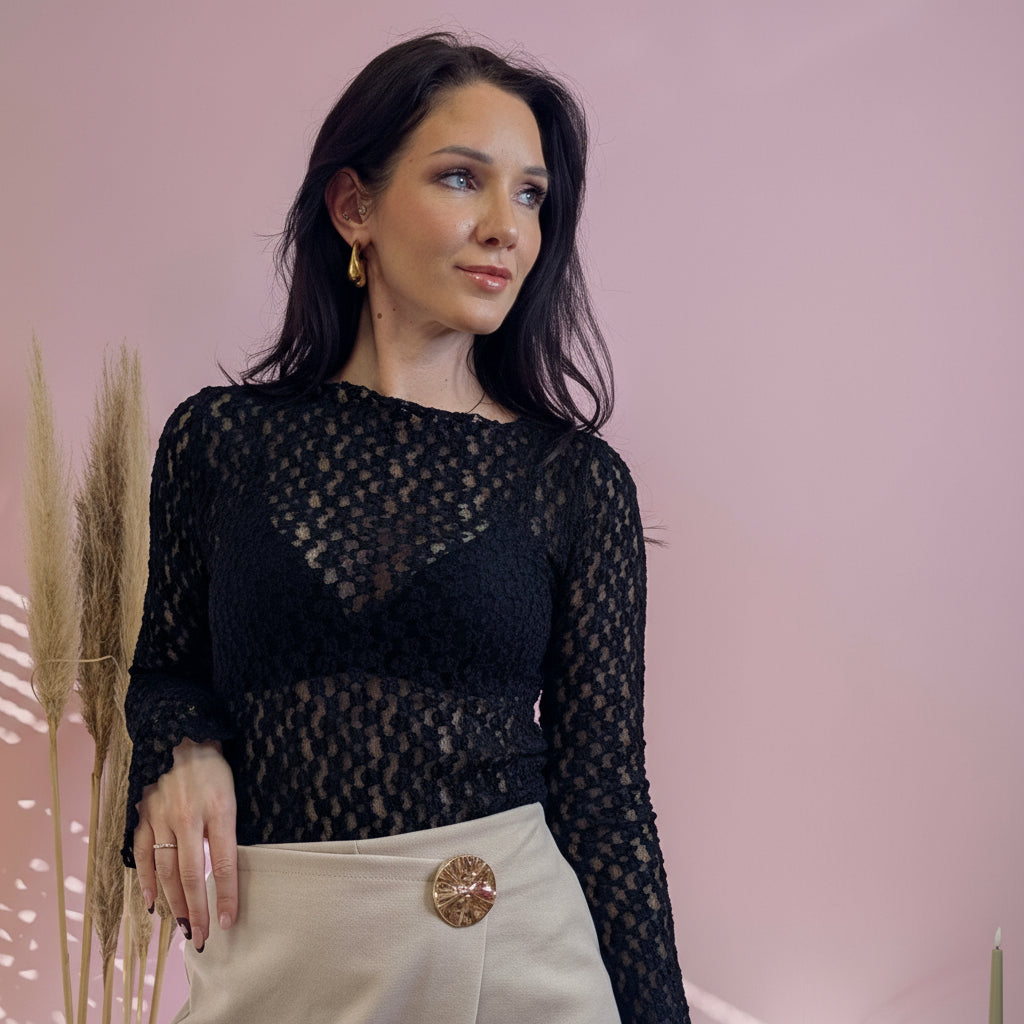 Es kombiniert den angesagten Sheer-Look mit einer wunderschönen, floralen Spitzen und fängt damit perfekt den lässigen Boho-Trend ein. Das transparente Material macht es zum perfekten Layering-Piece. Die eleganten, langen Ärmel laufen leicht aus und verleihen deinem Look eine romantische Note.