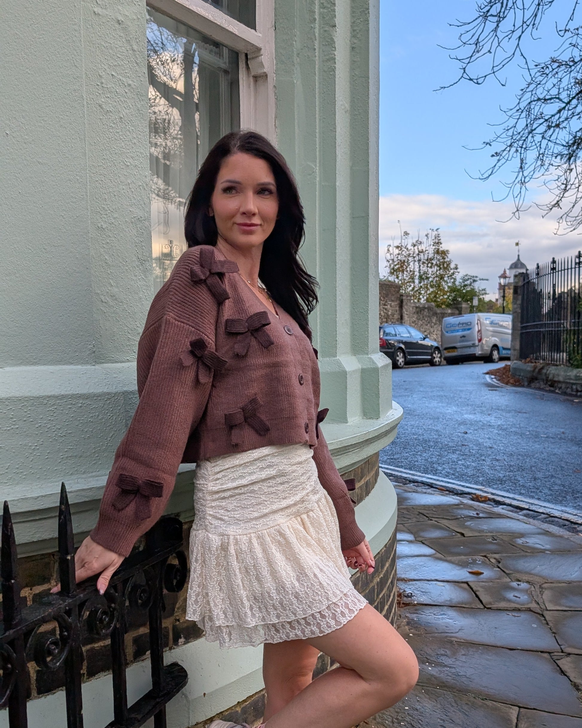 Gefertigt aus einem soften, angenehmen Strickmaterial in einem warmen Schokoladenbraun, ist dieser Cardigan dein perfekter Begleiter für kühlere Tage. Der moderne Schnitt mit V-Ausschnitt und klassischer Knopfleiste und den vielen Schleifen macht ihn super vielseitig.