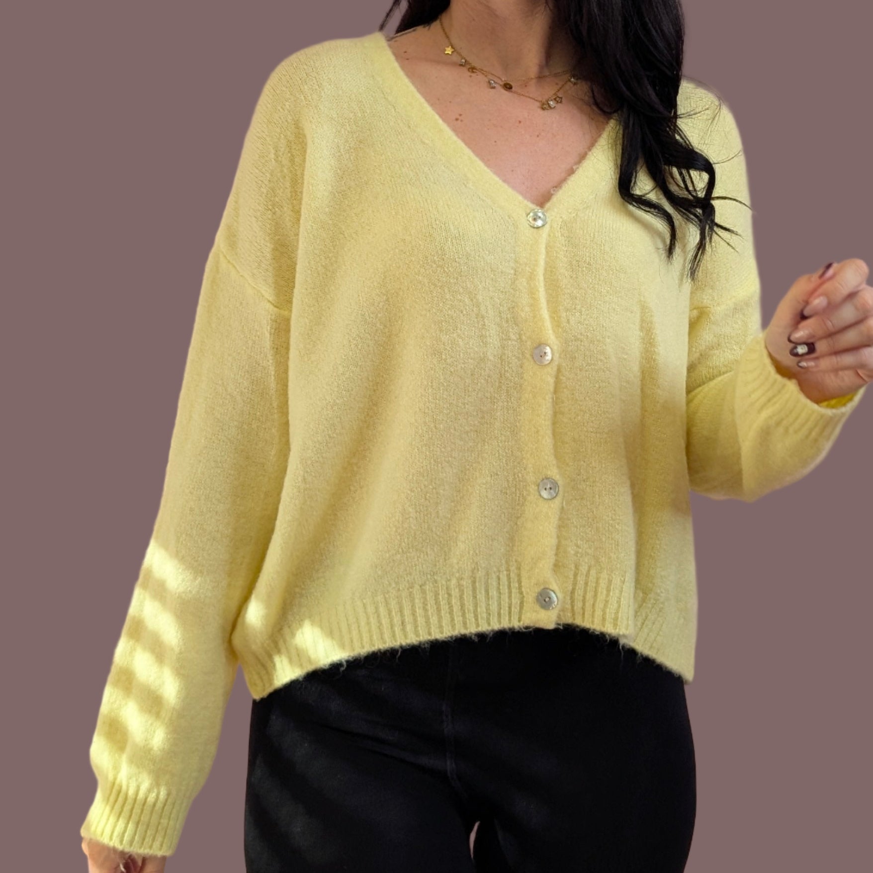 Bereit für deinen neuen Fashion-Crush? Sag Hallo zu unserem Kuschel-Cardigan in Butterlemon-Gelb! Wenn du es liebst, aufzufallen und deinem Look sofortige Power zu verleihen, ist diese Strickjacke dein perfektes Match.