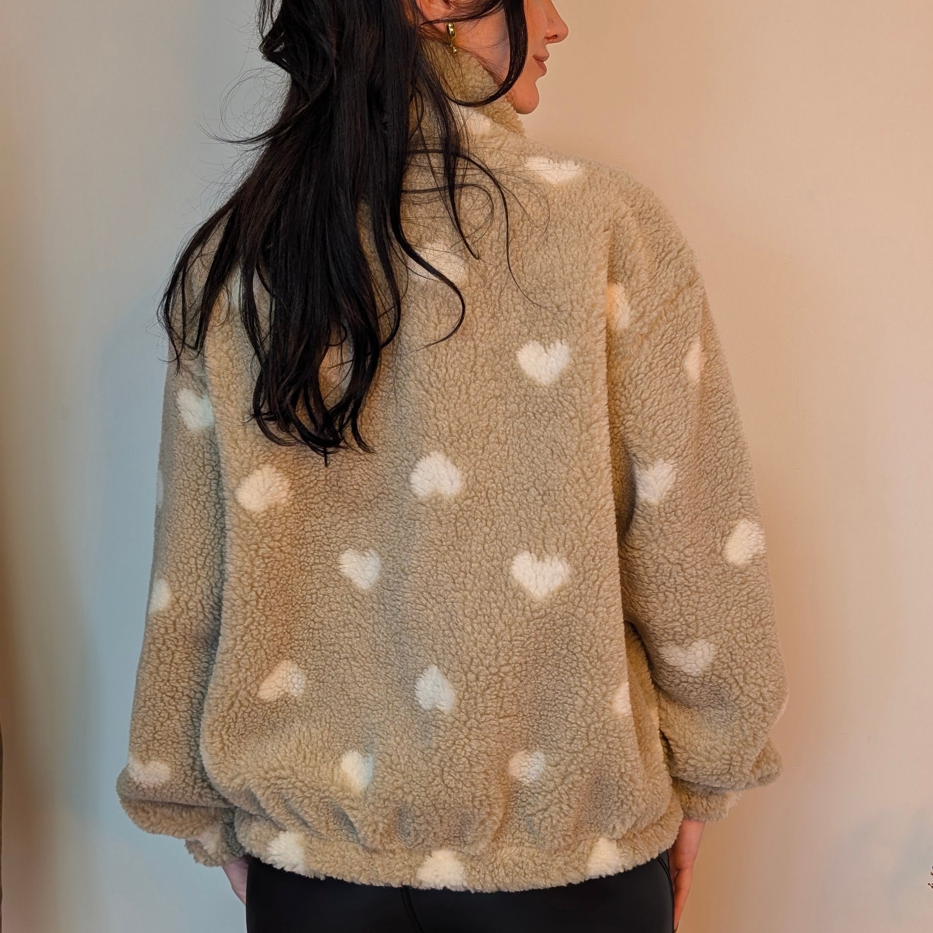 Bereit für den ultimativen Kuschelfaktor? Der kuschelige Teddy-Fleece in einem warmen, trendigen Beige-Ton (wie ein cremiger Latte Macchiato!) wird durch süße, weiße Herzen zum absoluten Hingucker. Der lässige Schnitt mit dem hohen Stehkragen hält dich an kühlen Tagen wunderbar warm.