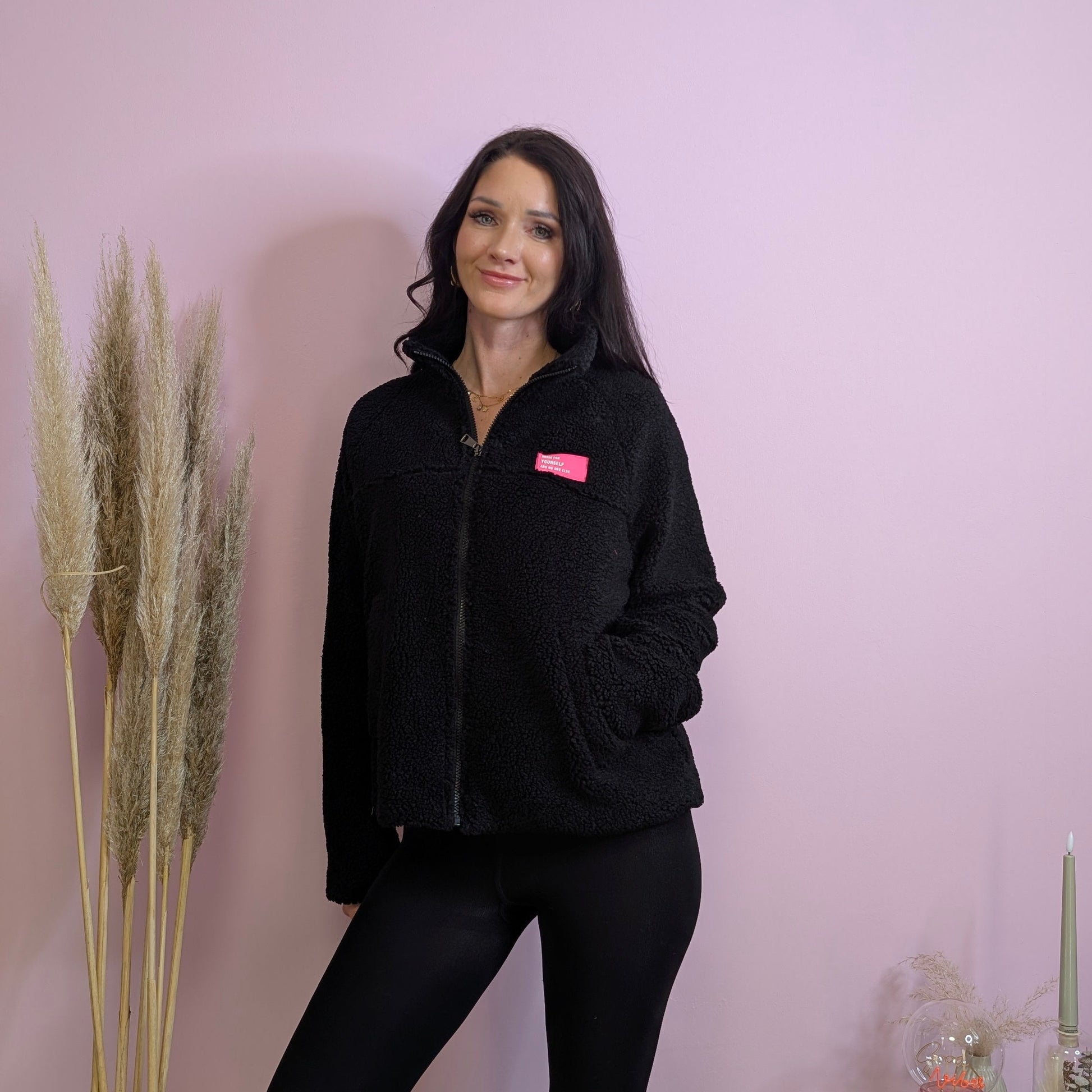 Stell dir vor: Du wirfst dir diese unglaublich weiche Jacke über, fühlst dich sofort eingekuschelt und siehst dabei mühelos top gestylt aus. Das tiefe Schwarz macht sie zu einem echten Allrounder, während das knallig-pinke Logo-Patch auf der Brust ein freches Statement setzt und alle Blicke auf sich zieht.
