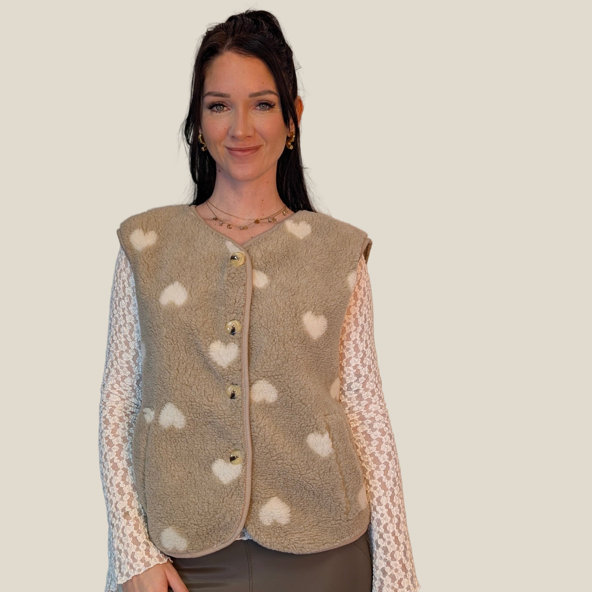 Bist du bereit für den ultimativen Kuschelfaktor? Verliebe dich in unsere neue Teddyweste Sweetheart. Diese superweiche Teddy-Weste ist dein perfekter Begleiter für den Lagenlook an kühlen Tagen. Mit ihrem süßen Herz-Print bringt sie sofort gute Laune in dein Outfit und hält dich dabei wunderbar warm.